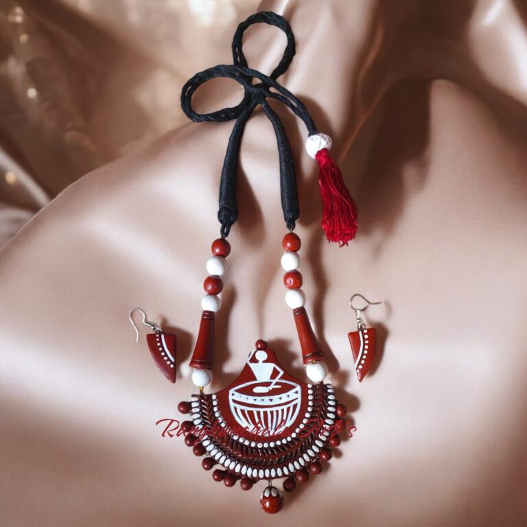 This jewelry set is a handcrafted terracotta necklace with matching earrings, inspired by traditional Warli tribal art. The round pendant showcases human figures in a circular dance pattern, symbolizing unity, celebration, and cultural harmony. Made from natural clay and finished in earthy red with white detailing, it reflects a strong connection to nature and Indian heritage. The beaded thread adds a rustic yet elegant touch, while the lightweight design makes it comfortable to wear. Overall, this piece represents a beautiful blend of tribal storytelling, eco-friendly craftsmanship, and modern ethnic fashion.