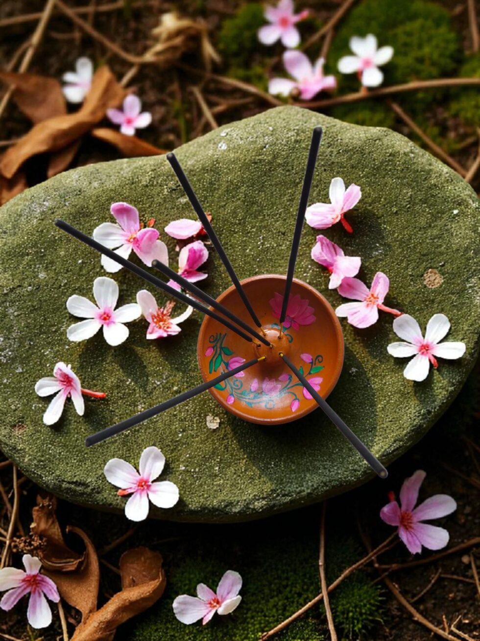 Styled with flowers and natural surroundings, this piece enhances the calming experience of meditation, relaxation, or daily rituals. The combination of earthy clay and artistic floral design makes it both a functional product and a decorative accent.