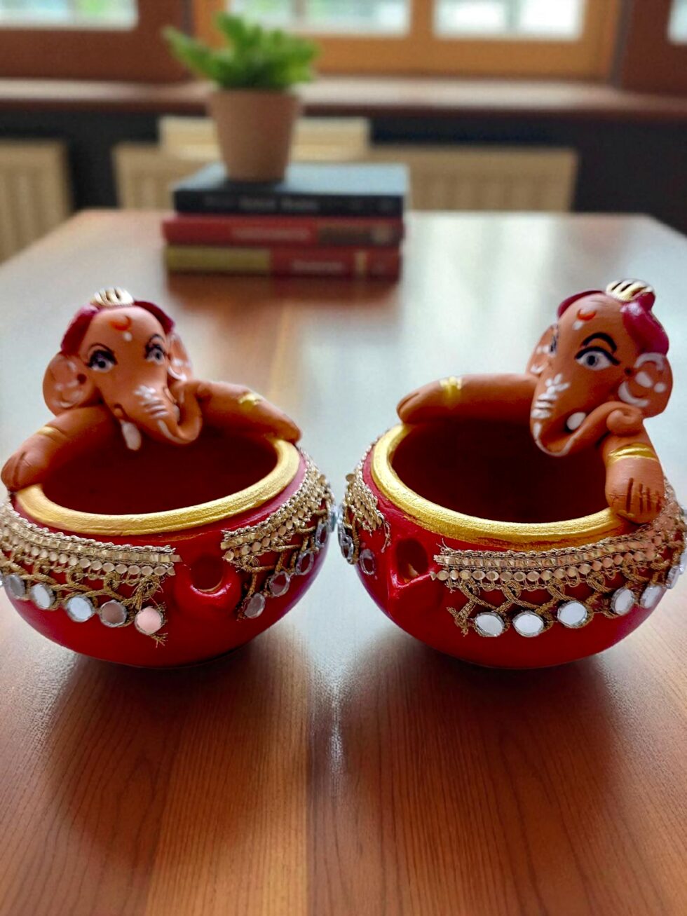 This luxurious terracotta Ganesh diya set is designed for a rich festive look. Featuring a vibrant red base with intricate golden lace detailing and mirror work, it exudes a royal charm.