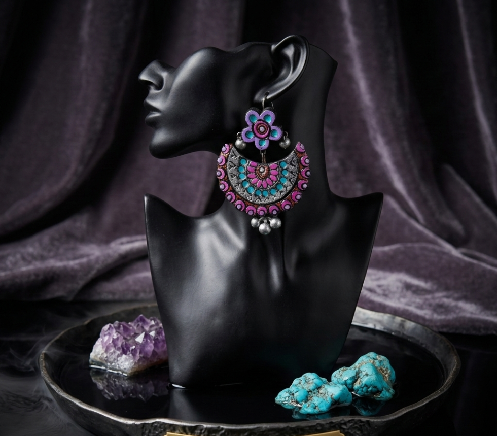 These vibrant statement earrings are designed with a beautiful floral mandala pattern in pink, teal, and black tones. The intricate detailing and bold circular structure give them a festive and eye-catching appeal.