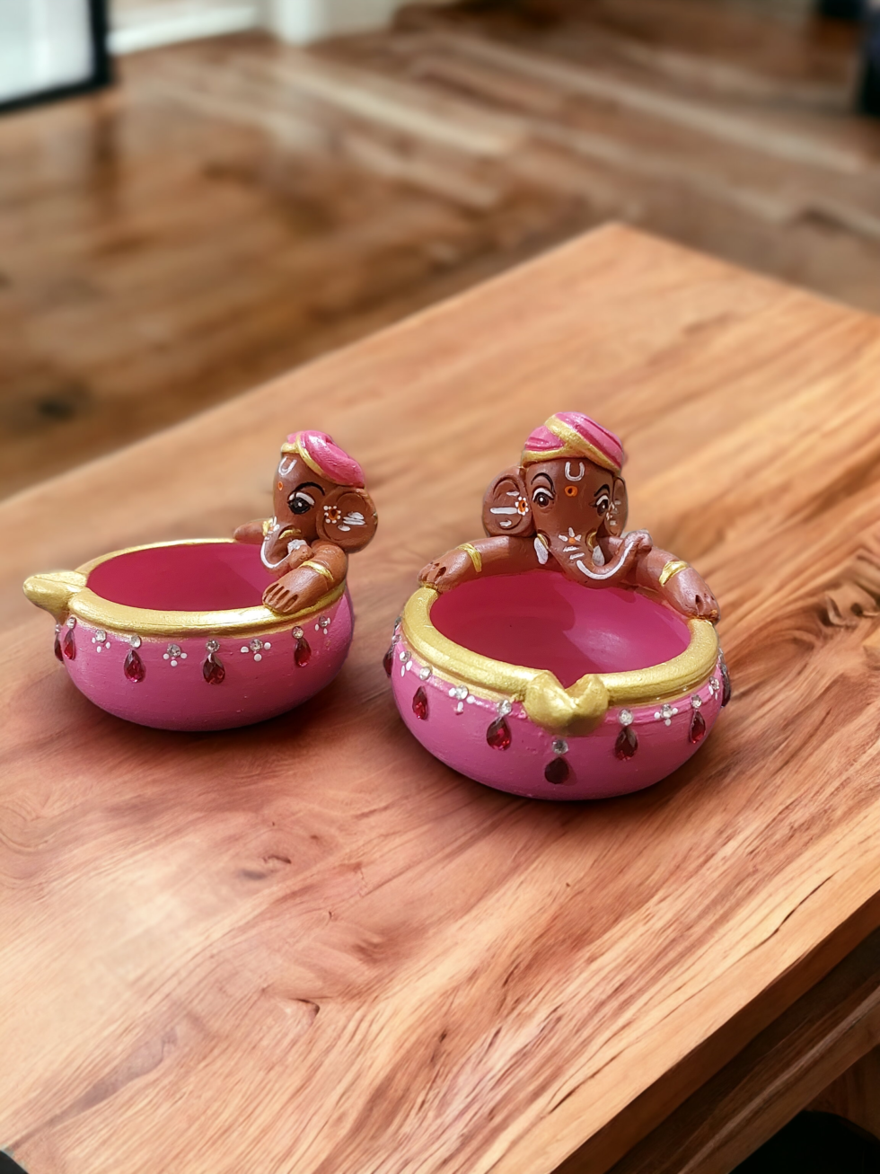 Add a divine and joyful touch to your home with this handcrafted terracotta Ganesh diya set. Designed with a cute and detailed Lord Ganesha figure resting on the edge, the diya features a soft pink base with golden finishing and subtle stone embellishments.